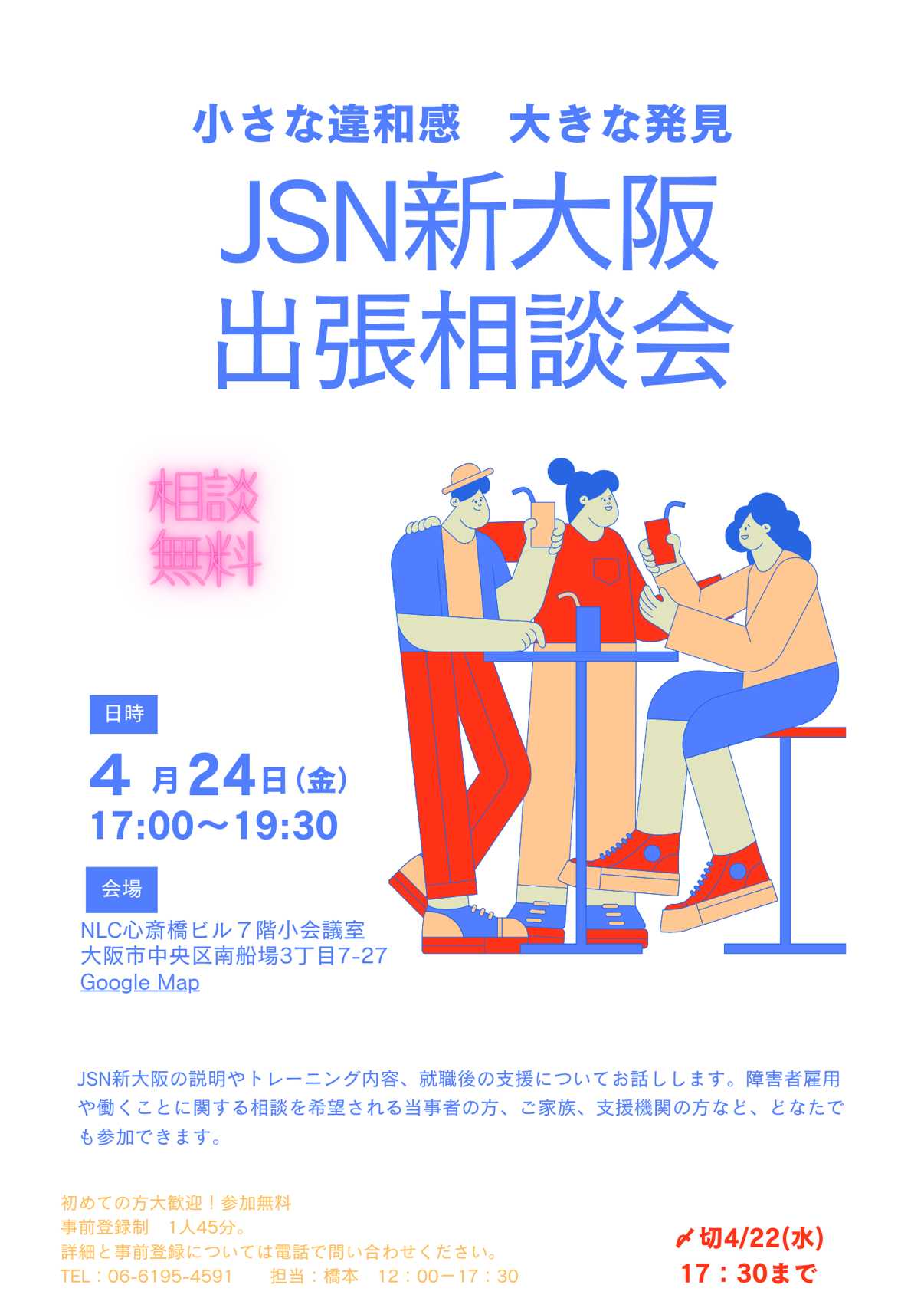 このたび、JSNの“アツい支援”を知っていただくために、心斎橋で出張相談会を開催します。
